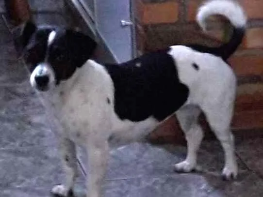 Pequena branca com manchas pretas pelo corpo.. pequenas manchas na barriga.. rabo ponta branco. Cara preta. Orelha caída.. castrada.. cadastrada através de chip na zoonose de BH.