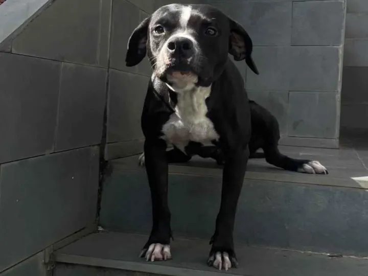 Nancy, pit bull fêmea de 2 a 6 meses, busca um lar. Ideal para quem quer um cão de guarda carinhoso e brincalhão. Socializa bem com conhecidos e crianças.