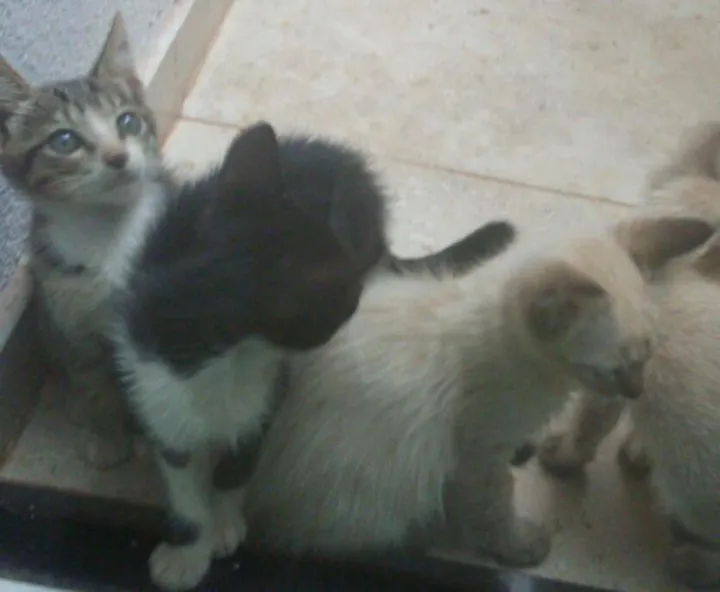 Encontrei quatro gatinhos na rua e estou cuidando, não posso ficar com eles e estamos a procura de um dono, são três macho (Branco com orelhas pretas e olho azul, tigrado e um preto e branco) e um...