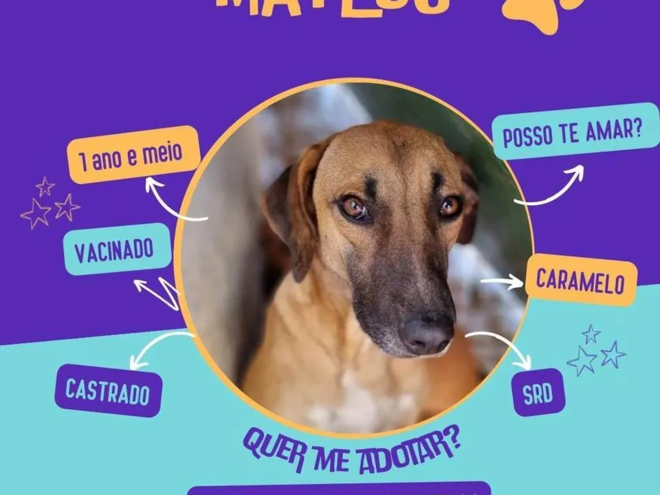 Conheçam o Mateus, um cãozinho SRD-Vira Lata lindo e muito especial. Com 2 anos de idade e uma pelagem caramela, Mateus é um cão de porte médio cheio de amor para dar. Ele é castrado, vacinado e vermifugado, pronto para encontrar um novo lar. Com seu temperamento dócil, Mateus se adapta facilmente a uma casa com quintal, onde possa correr e brincar. Ele é sociável com outros cachorros, então será um ótimo amigo para outros pets da família. Mateus está à procura de uma família amorosa que possa dar a ele a atenção e o carinho que merece. Se você tem espaço no seu coração e em sua casa para um novo amigo, venha conhecer o Mateus. Ele está à espera de uma nova chance de ser feliz e fazer alguém feliz também. Não perca a oportunidade de dar a este cãozinho uma nova vida cheia de amor e cuidados. Adote o Mateus!