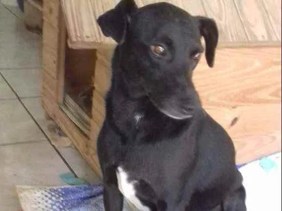 Cachorra preta com mancha branca no peito, porte médio, dócil, tem muito medo de barulho.Fugiu do bairro Santa Terezinha(pendura saia).qualquer informação por favor entrar em contato