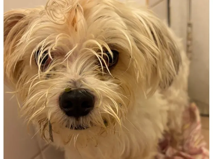 Recentemente, encontrei esse cachorro assustado, correndo entre os carros no bairro Planalto. A pelagem dele é branquinha e a pele está um pouco vermelha. Seus olhinhos estão em cereja, ele está sujo mas aparenta ter sido tosado recentemente. Acredito que esteja perdido.