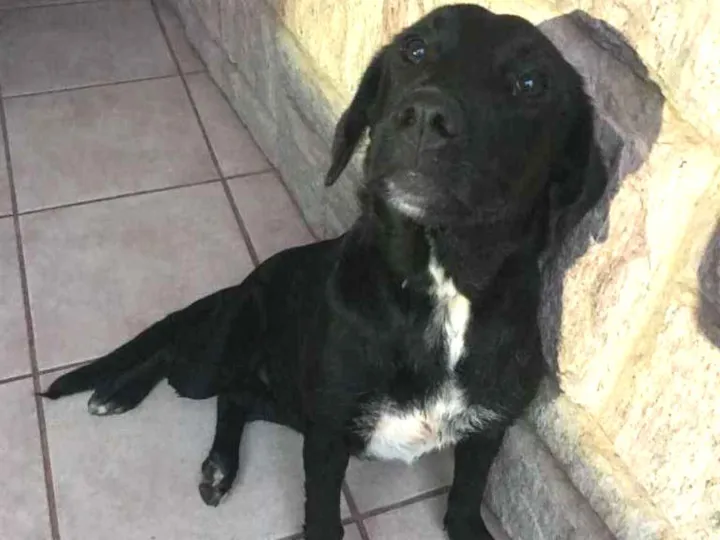 Cadela de porte médio, aparenta ser filhote mas a idade não foi verificada, pelagem preta com poucas manchas brancas, dócil, estava de coleira marrom claro. pelo baixo.