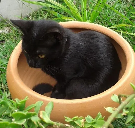 Toda pretinha, apenas uma pequena mancha branca na barriga, olhos bem verdes. Usa coleira com guizo no pescoço. É muito mansinha. Perdida no bairro do Segredo.