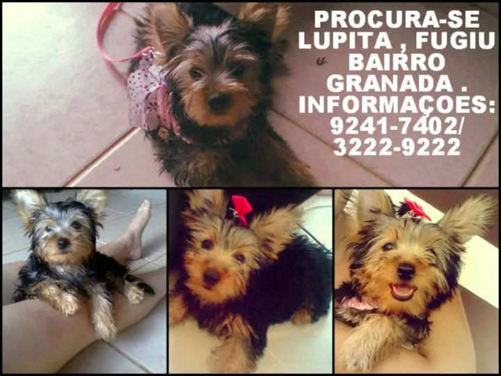 COMPARTILHEM POR FAVOR A ULTIMA INFORMAÇÃO QUE TIVEMOS É QUE ELA FOI VISTA SENDO LEVADA POR UM CARRO PRETO NA RUA ITAIPU . POR FAVOR QUEM A LEVOU DEVOLVA - A A DONA ESTÁ SOFRENDO MUITO . PROCURA - SE filhote da Raça Yorkshire atende pelo nome de LUPITA (6 meses ) . Nessa tarde de domingo (16/03) a mesma desapareceu por volta das 17:30 . Local BAIRRO GRANADA RUA ÁGUA VERMELHA PERTO DO HOSPITAL MUNICIPAL por favor quem ver ou souber de algo entra em contato e ajude nos a divulgar 9241-7402/3222-9222