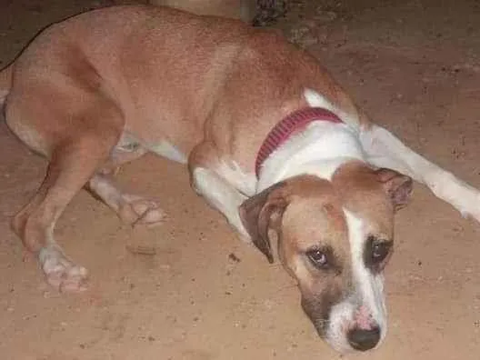 Ele é um mestiço de Pitbull com vira-lat, esta usando uma coleira vermelha com listras preta. perdemos ele durante a viagem e o motorista não podia voltar pra gente procurar, a última parada em que eles estava na van foi em Janaúba, sou de Uberlândia-MG meu número é (34)98838-4886.