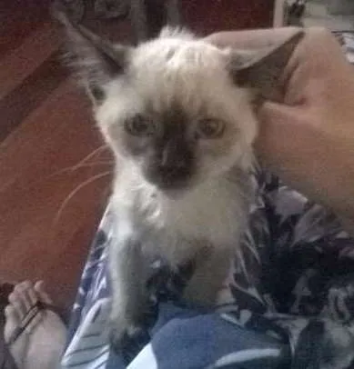 Oi, tudo bem? Eu estava andando no meu bairro, quando vi esse filhotinho todo encolhido de medo, eu resolvi pegá-lo pra tentar ajudar ele, porém não posso ficar com ele ... Gostaria de ajuda pra achar alguém que possa cuidar dele o mais rápido possível, eu suspeito que ele seja mestiço de siamês... Quem se interessar pode me chamar no face ou no whatts mesmo 034991131242