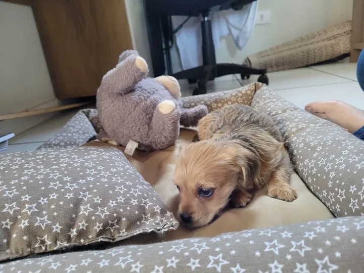 Cachorra SRD dócil, mistura de shitzu com salsicha. Come ração, faz necessidades no jornal, extremamente companheira! Estamos sem espaço para criar neste momento, mas super bem cuidada!