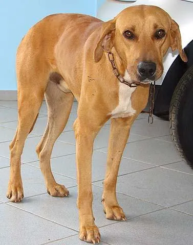 Encontre um novo amigo! Fila macho de 2 anos disponível para adoção em Campo Grande/MS. Encontrado com corrente e coleira anti-leishmaniose. Buscando um dono.