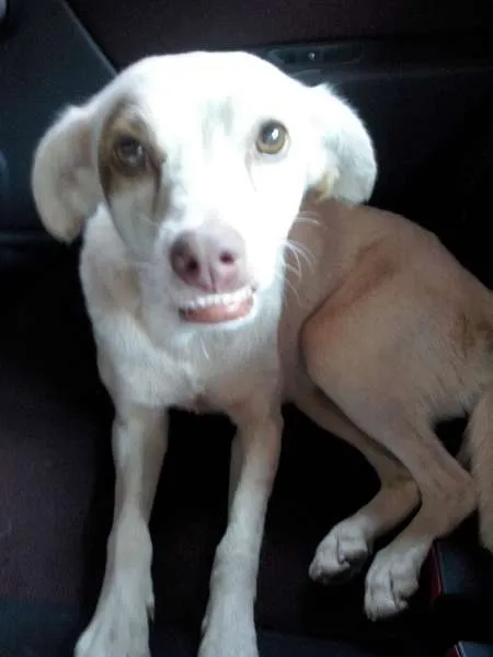 Encontrei no sábado dia 30/08/14, entre Rua Bahia com a Rua Amazonas, uma cachorra na côr branca, fêmea, porte médio, tem uma mancha marron claro arredondado no olho direito, muito dócil, parece estar sentindo muito a falta do seu dono, ela está comigo, meu nome é Elizabeth cel.9985-7488