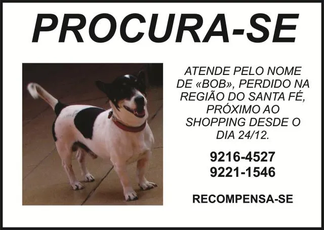Procuro um cão, porte pequeno, branco com mancha preta nas costas, orelhas e olhos pretos, uma estrelinha na testa branca, entre as orelhas, atende pelo nome Bob, perdido desde 24/12, na região do SANTA FÉ, próximo ao SHOPPING CAMPO GRANDE