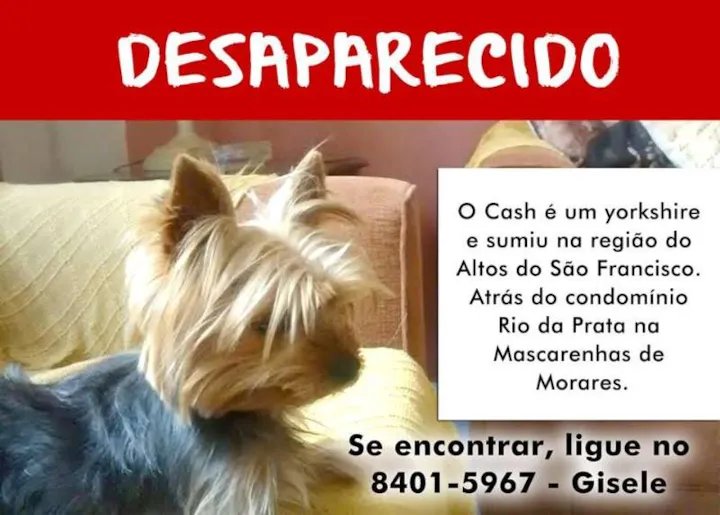 Olá, meu nome é Gisele e estou desesperada à procura do meu cachorrinho Cash, da raça Yorkshire. Ele sumiu ontem pela manhã, antes da chuva, daqui de casa, estava usando uma roupinha xadrez vermelh...