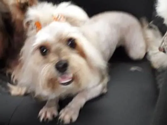 Pequena, caramelo, foi tosada recentemente. E possui o rabinho bem pequenininho.