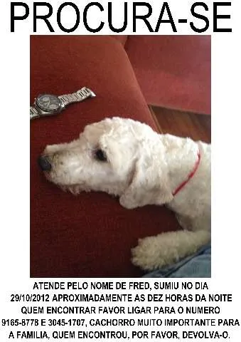 Cachorro docil, pequeno porte, branco, atende pelo nome de FRED, sumiu no dia 29/10/2012 por volta das 22:00 horas da noite, estava com uma fita vermelha em volta do pescoco, tosado, pelagem curta.