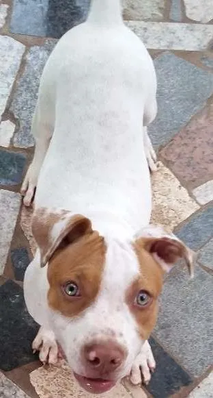 Ela é branca com detalhes em marrom claro tipo caramelo na cabeça e no rabo si olhar de perto várias manchinhas caramelos ela tem quatro meses e é muito mansinha está sem a coleira pq tirei ontem p...