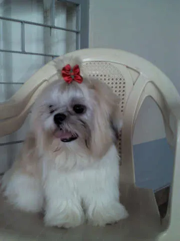 Cachorra caramelo claro, marrom e branco, com coleira de leishmaniose. Super dócil, não late e adora crianças. Ideal para famílias com crianças pequenas.