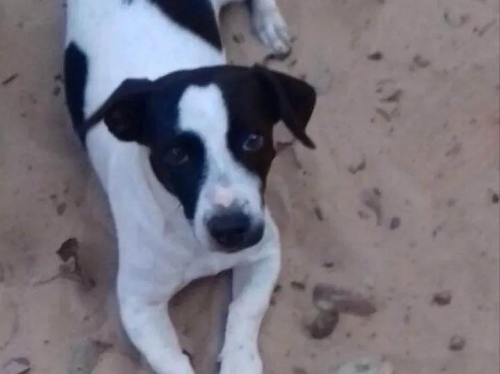 Baixinha, alongada, parece uma vaquinha com suas manchas pretas. A do rosto lembram um coração.