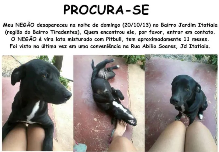 O NEGÃO desapareceu na noite de Domingo (20/10/13) no Bairro Jardim Itatiaia (Região do bairro Tiradentes) ele é Vira lata com Pitbull, tem o porte do pitbull, é manso e bem brincalhão.