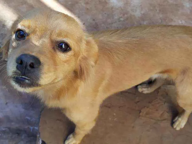 Peter é dócil, tem rabinho curto e é amarelo. Não estava de coleira.