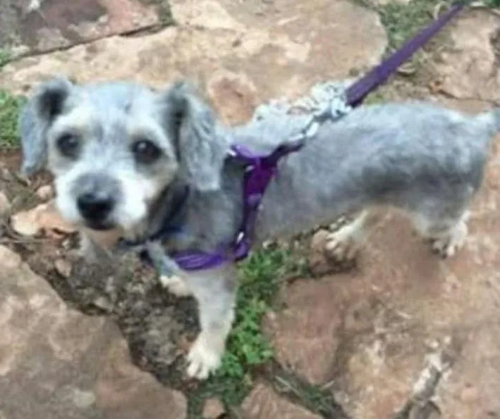 Cachorro pequeno, fica peludo e tem o pelo com tons diferentes de cinza.