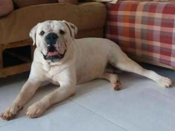 Bulldogue campeiro todo branco, dócil, com coleira de corrente no pescoço. atende por Poseidon.