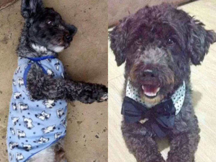 Poodle preto com cinza,O peito dele até a boquinha é branco,bigode meio marrom,rabo pitoco e na parte íntima dele tem uma pinta.