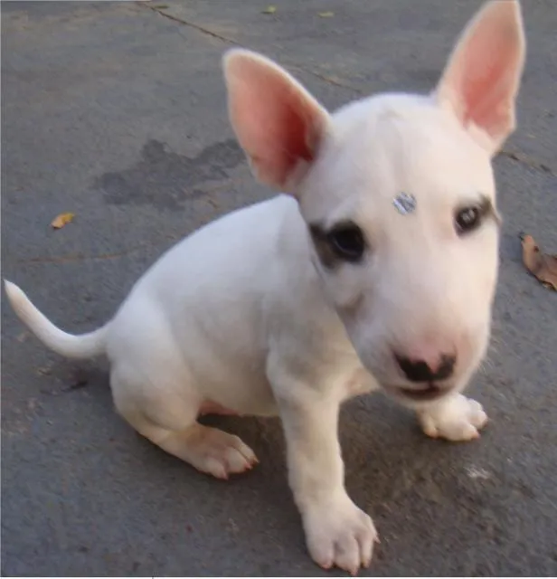 Adote a adorável Sophia, uma filhote Bull Terrier branca com mancha pirata nos olhos e cicatriz na cabeça. Ela está à espera de um lar em Campo Grande/MS!