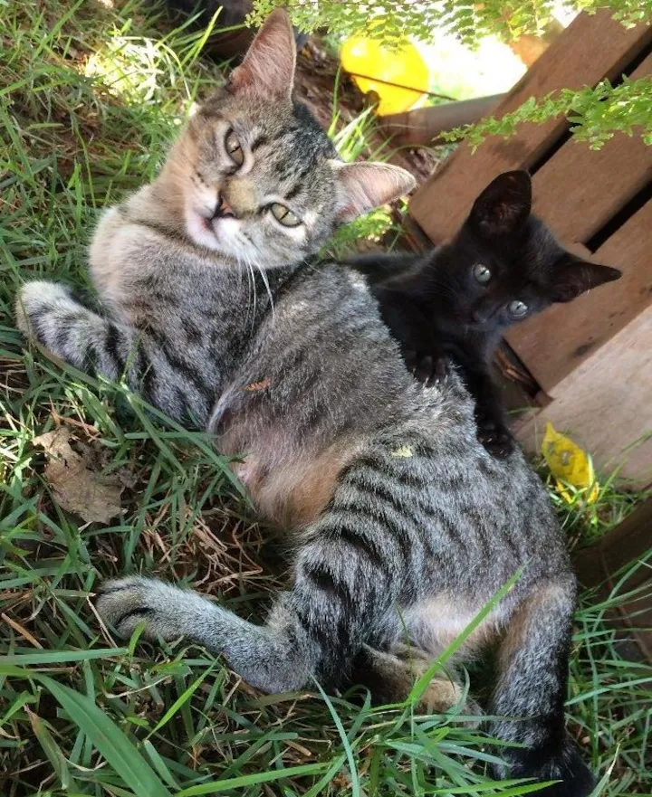Essa linda gatinha rajada se chama Fofa, apareceu em minha casa totalmente assustada e faminta, logo providenciei sua castração e seria posta pra adoção na semana seguinte!! Ocorre que na semana seguinte uma ninhada de 4 pretinhas (que nasceram prematuras) com 2 dias de vida foram abandonadas pela mãe biológica e sem saber o que fazer as trouxe pra casa, mas já sem esperanças que sobrevivessem!! Ao chegar em casa com as 4 besourinhas, prontamente Fofa se apaixonou, entrou dentro da caixa de papelão em que elas estavam e já decidiu naquele instante que era MÃE, não bastasse isso, com tanto instinto materno, em menos de 24 horas começou a produzir leite pra cuidar de suas filhas adotivas!! Dia 03/12 completam 2 meses de vida... Até hoje ela cuida das gatinhas como se as tivessem parido, e portanto, seria muito INJUSTO não permitir que ela fique com pelo menos uma de suas filhas!!! As imagens acima dizem muito mais que quaisquer palavras que eu escreva aqui.