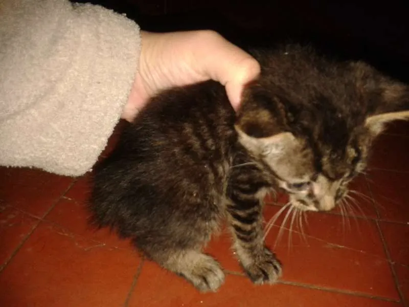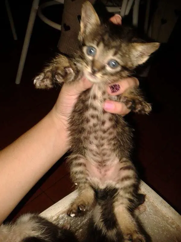 Gatinho filhote macho, rajadinho de branco e preto e pelo curto. Super dócil em idade de adoção.