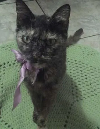 Gata tranquila, carinhosa, velhinha, não tem mais nenhum dente, portanto precisa de ração pastosa. está com um filhote fêmea de 30 dias. Precisa ser castrada. Já foi levada ao veterinário, está tomando suplementos e medicamentos, pois foi encontrada na rua. Já foi vacinada e vermifugada. Tudo o que precisa está comprado, inclusive shampoo para a dermatite. Não podemos ficar com elas pois já temos outros animais.