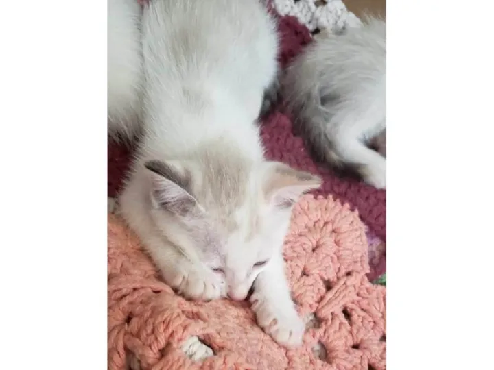 Gatinha fêmea branca mesclada com bege, olhos azuis, para adoção responsável. Ideal para apartamento telado ou casa sem acesso à rua. Saúdavel e brincalhona.