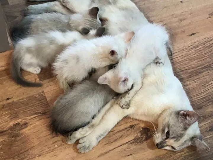 Encontramos esta gata no estacionamento do nosso condomínio com seus filhotes e pegamos para que não ficassem vulneráveis na rua. Infelizmente não podemos ficar com eles, então estamos doando para que possam ter seus lares.