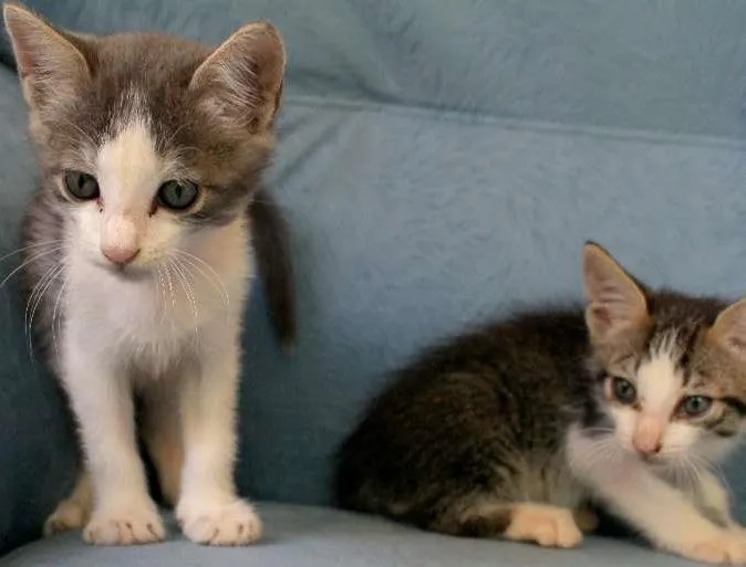 Dois lindos filhotes resgatados da rua pois foram abandonados. Estavam morrendo de fome. Já comem ração e usam a caixa de areia, são brincalhões e mansinhos.