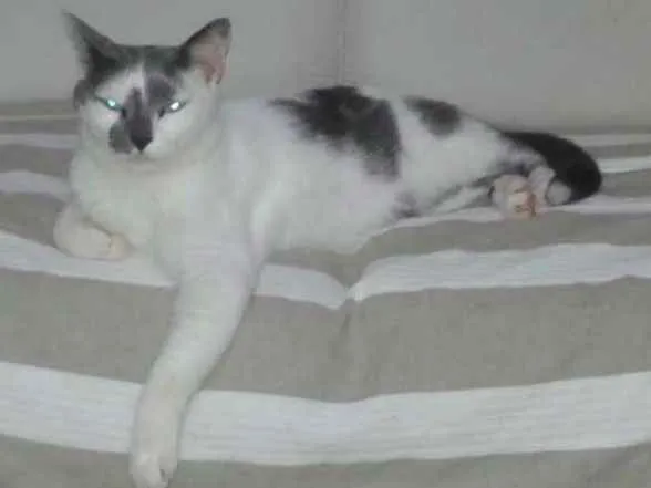 branco com manchas cinzas , olhos azuis, rabo cortado pela metade (operado pós acidente desconhecido) , castrado. dócil, carinhoso. acaricia o rosto de quem gosta e morde o queixo kkkk forte mas ...