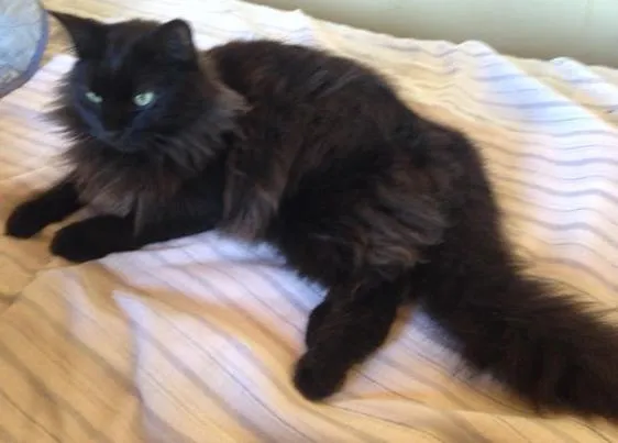 Gata preta com mesclas marrom e com pelagem parecida com angorá de porte grande, rabo bem volumoso e tbb mesclado com marrom olhos esverdeados, mia escandalosamente por qualquer coisa... Tem sensibilidades a certas rações.