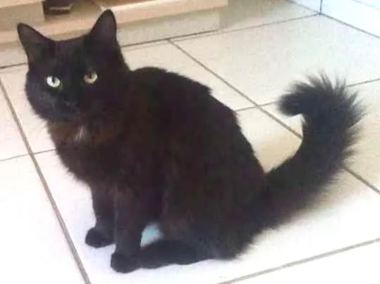 Gata com aproximadamente 1 ano, preta com o rabo bem peludo, sumiu na região do Jd. Tijuca I (próximo a av. Conde de boa vista) está usando uma coleira de corações coloridos.