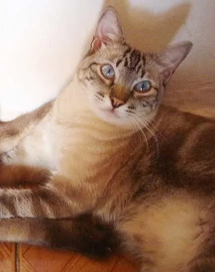É castrado, SRD, olhos azuis pelo tigrado mais para as cores claras,cinza, bege, creme e marrom. Tem 4 anos e nunca havia sumido antes, pois sempre foi muito caseiro.