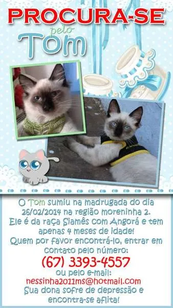 Queria tanto meu tom de volta, ele foi largado no lixo com os olhinhos ainda fechado de tao pequinino que era, minha cunhada achou e levou pra minha que me deu, criei ele na chuquinha com leite ninho, tinha que dar leite de duas em duas horas pq era muito bebezinho, tbm tinha q fazer massagem pra ele conseguir fazer as necessidades, ele estava bem doentinho tava com diarreia e o bumbum todo assado e saindo pra fora. eu e o Fernando Wagner cuidamos dele com muito carinho, se apegamos muito a ele, e ele com agente, pois ele não teve maezinha, agente que fomos os pais dele,eu tenho mais dois gatos que só ficam miando e chorando sentindo falta dele, pq são muito apegados a ele. Por favor quem o encontrou ou pegou talvez achando que não tinha dono, devolva-me, por favor. Ele atende pelo nome de Tom ou Tomzinho