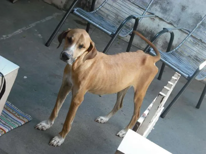 A Magrela apareceu em casa, no dia 01/07, depois do almoço e estava chovendo um pouco,mas à noite tive que recolhê-la,pois a chuva tinha engrossado,a partir desse dia ela não levantava,só foi levantar 4 dias depois,de ter comido uma bela de uma polenta na hora do almoço. O veterinário veio aqui no segundo dia,e falou que estava com infecção no útero e sintomas de leishmaniose. Por fim,dia 28 ela criou 13 cachorrinhos, só restou 1(machinho), que chamo de Pequerrucho. Ontem (08/08) a Vigilância veio aqui para recolhê-la,mas como está com filhote não a levaram, mas deram 1 semana para desmamar o cachorrinho para recolhê-la. Venho através de vocês, pedir a ajudar para o tratamento da doença e para que ela e o Pequerrucho sejam adotados. Não posso ficar com eles,pois fim de novembro vão vir 2 cachorros, e na casa não tem muito espaço.