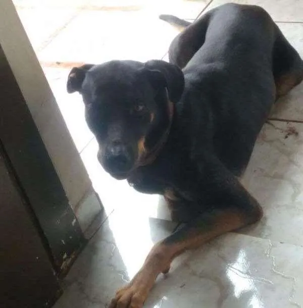 Um cão de cor preta, peito e extremidade das patas na cor bege, mestiço americano caçador, está com uma coleira de couro marron e com a coleira anti pulga, atende pelo nome de TOBY. Está com o nome na coleira, estava nas proximidades do supermercado São Francisco. Dourados MS.