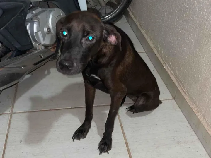 Essa cachorra apareceu no meu portão há quase um mês bem Magrinha e parecendo estar com muita sede até então estou dando comida água cuidando só que irei mudar para apartamento e não consigo levar ela comigo e até hoje não achei o dono