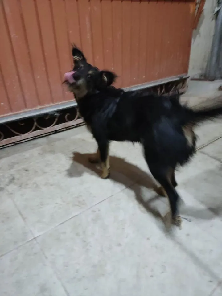 Ela tem uma pelagem escura, preta, os cabelos são meio encaracolados, não tem muito o que falar, as patinhas são meio amarronzadas, a sombrancelha também, ela tem essas partes marrom no pescoço, no peitoral, é uma cor tipo caramelizada