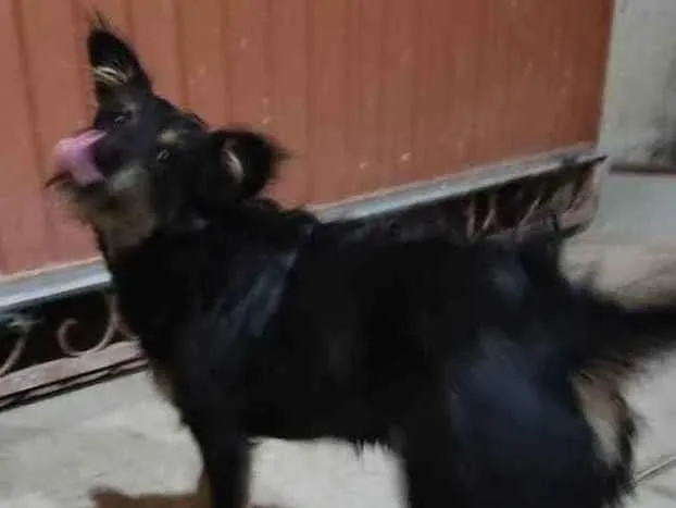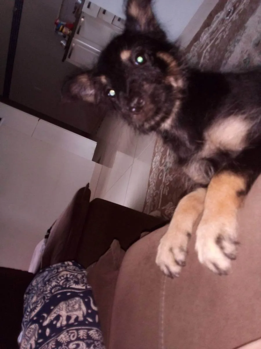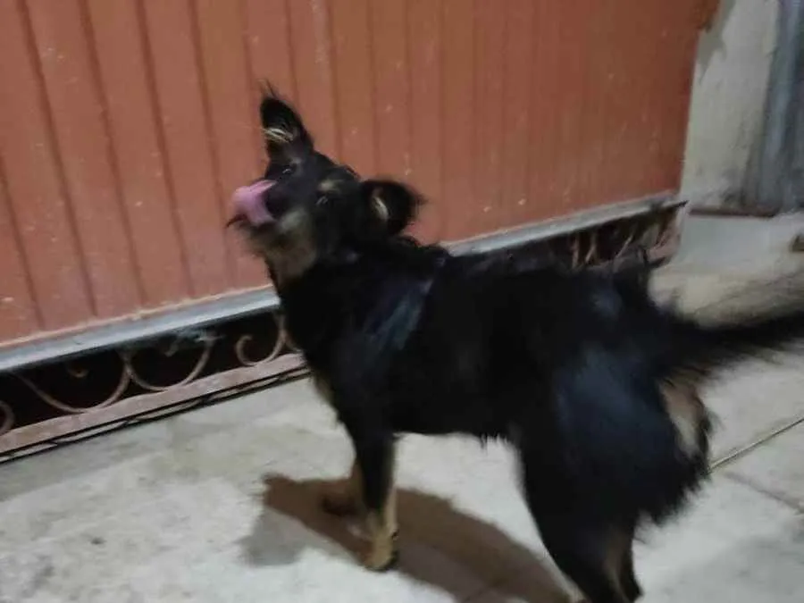 Ela tem uma pelagem escura e encaracolada,tem patinhas na cor de caramelo,a sombrancelha também,ela tem essa cor no pescoço e no peitoral, ela está em Sinop