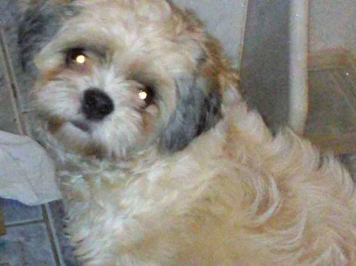 Shih Tzu pelagem de cor amarela com branco e ponta das orelhas preta. É castrada, muito dócil, quando sumiu estava com pelagem curta. Faz acompanhamento da doença do carrapato.