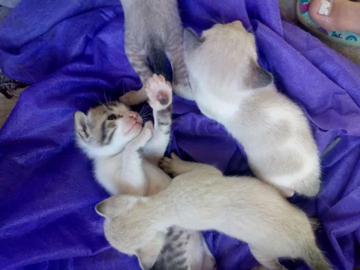 Estou doando os filhotes da minha gata. Ainda estão desmamando . São 4 filhotes: dois machos ( Mingau e Thundercat) e duas fêmeas ( Amely e Minie). Três deles são brancos / negra e um deles é branco e preto com a cara marron.
