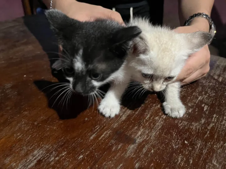 Tenho 2 gatinhos para adoção, uma branquinha fêmea e um macho preto e branco.