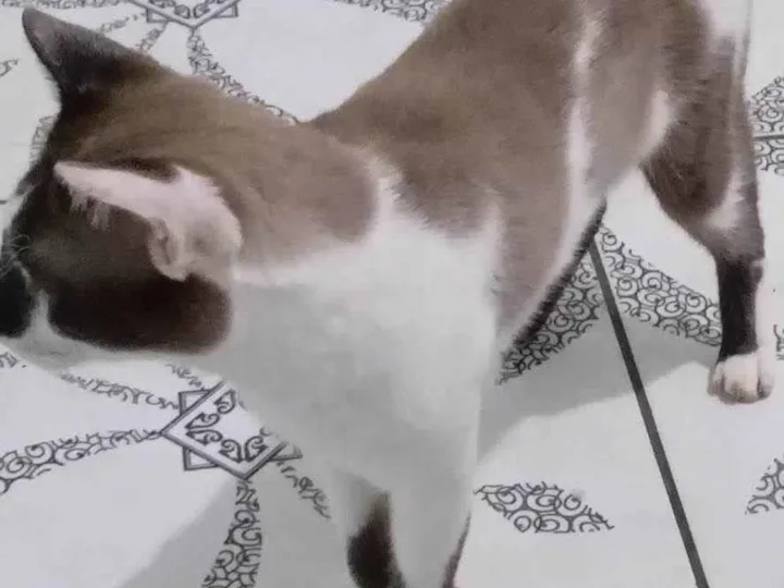 Siamês é um gato carinho, ele perdeu a tutora e se encontra num lar temporário. Ele é dócil, e curioso.