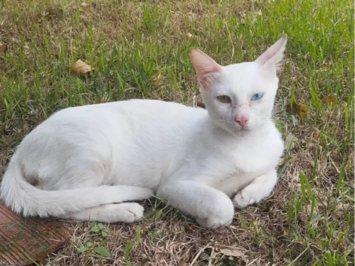 Conheça o Alvinho, um encantador gato macho da raça Siamês, com pelagem branca e aproximadamente 7 a 11 meses de idade. Este lindo felino possui porte médio e um temperamento dócil e calmo, perfeito para quem busca um companheiro tranquilo e afetuoso.