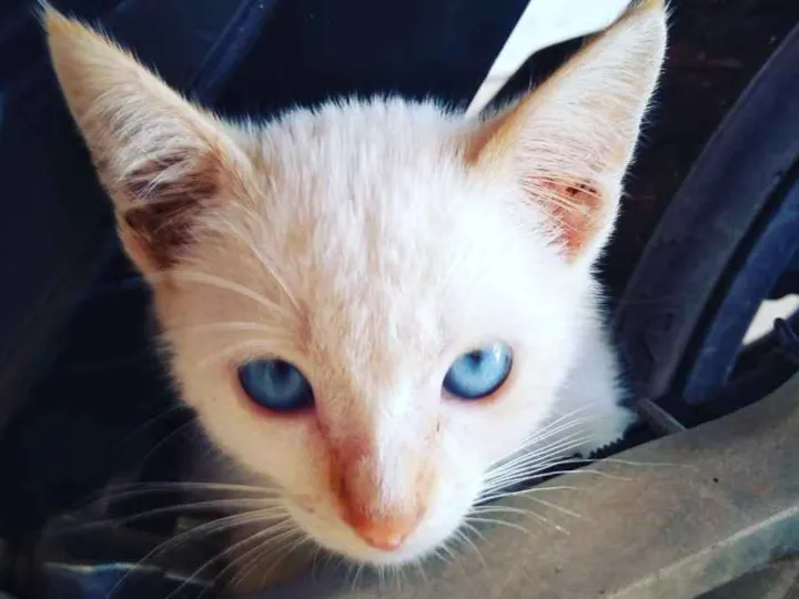Gatinho muito lindo de olhos azuis. Muito brincalhão e carinhoso. Eu o encontrei perto de casa, infelizmente não posso ficar com ele pois minha cadela mata gatos.