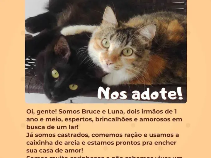 Conheça Bruce e Luna, dois irmãos de 2 anos. Bruce tem uma pelagem preta e Luna é rajadinha e são de porte pequeno. Ambos são castrados, vacinados e possuem um temperamento dócil e brincalhão, mas também são calmos e independentes. Bruce e Luna adoram brincar, mas também são carentes e adoram a companhia de humanos.